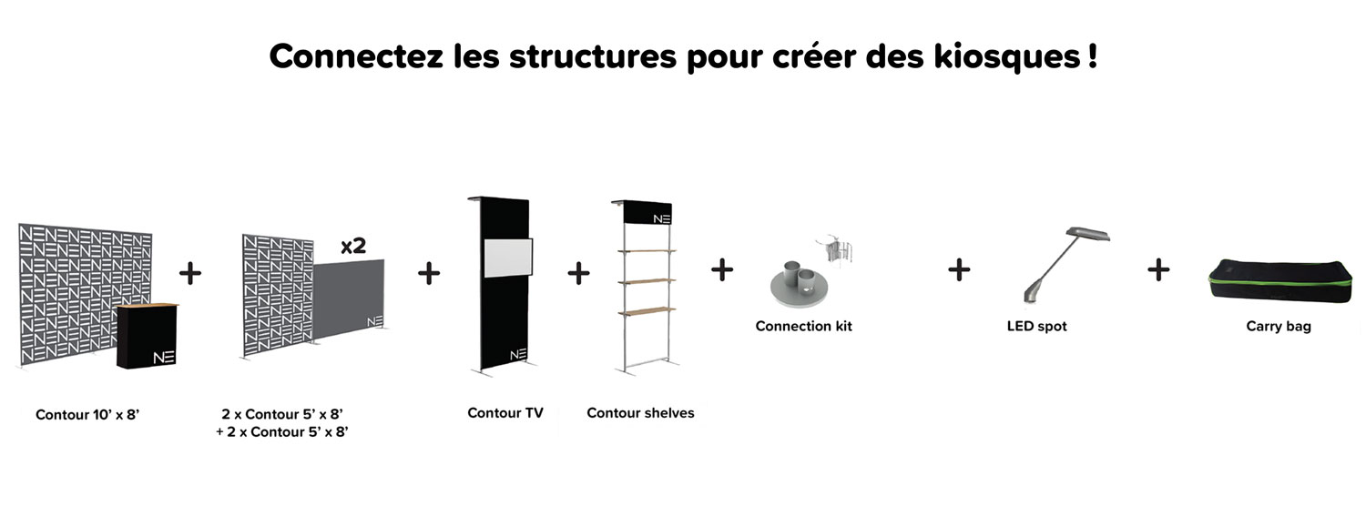 The Contour is a portable kiosk with a tubular structure. It consists of an aluminum tube that is covered with a sublimation printed fabric. The structure mounts quickly without tools or spare parts. The visual fits like a pillowcase and covers the entire frame for an exceptional rendering.