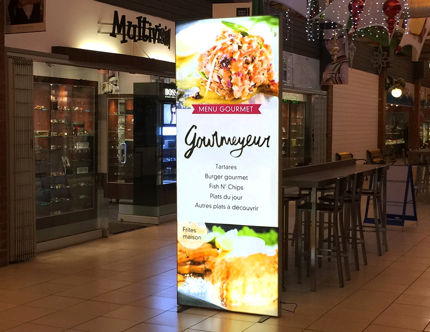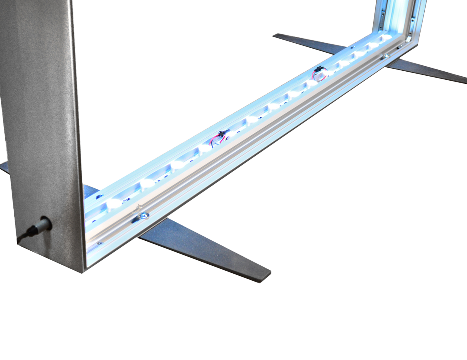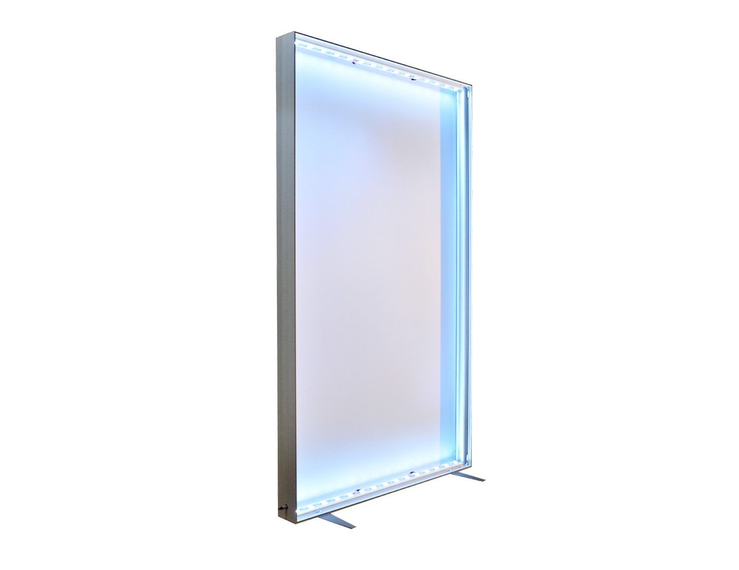 The Panoramic Lightbox is made of aluminium profiles, LED strips and a sublimation print on fabric. The finish is elegant and perfect thanks to its corner brackets. The light diffusion is homogeneous, a silicone seal allows to hang the visual to the structure, which makes the assembly and disassembly simple, fast, and fast. Its ingenious structure allows to assemble several modules together, for infinite configurations and uses.