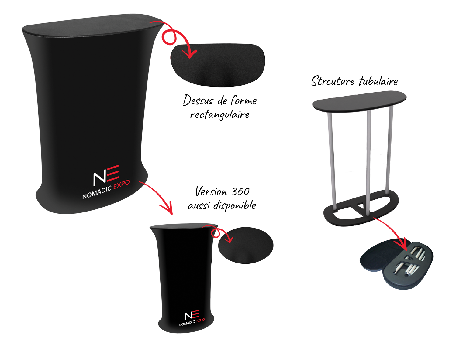 The portable counter is a multifunctional and essential element. Ideal for showcasing products and literature, this reception area is also used to display your brand with the personalized print. Several characteristics distinguish our portable counters, but all are practical and of good quality.