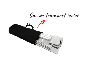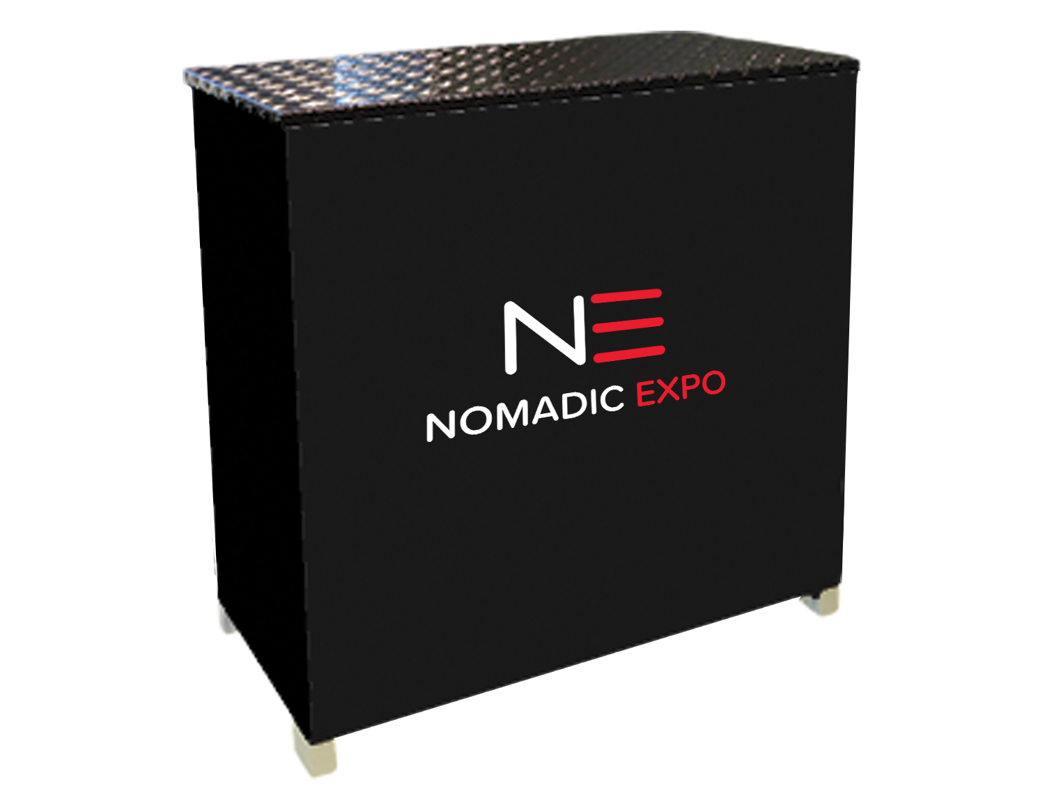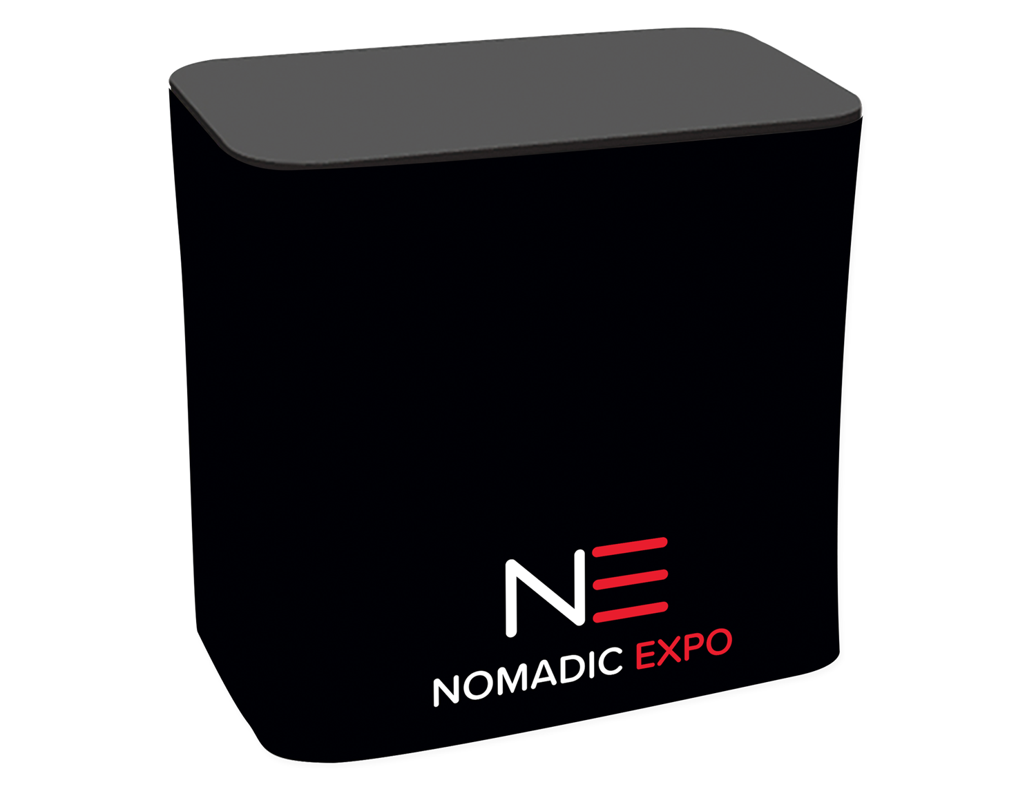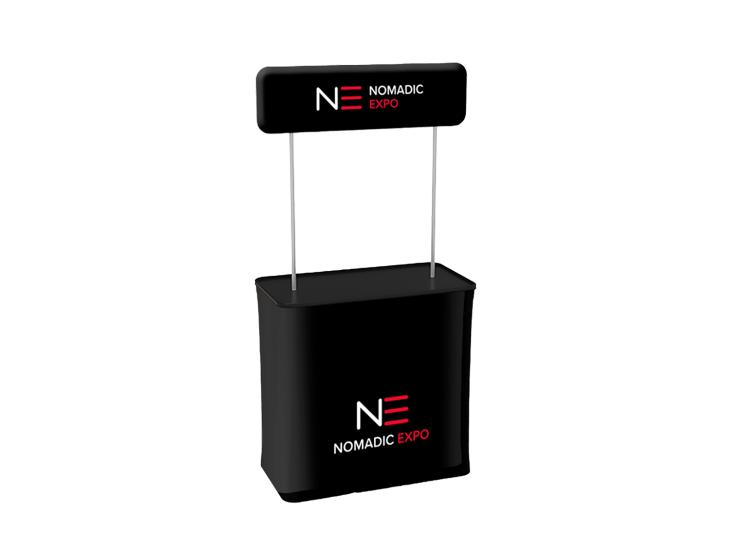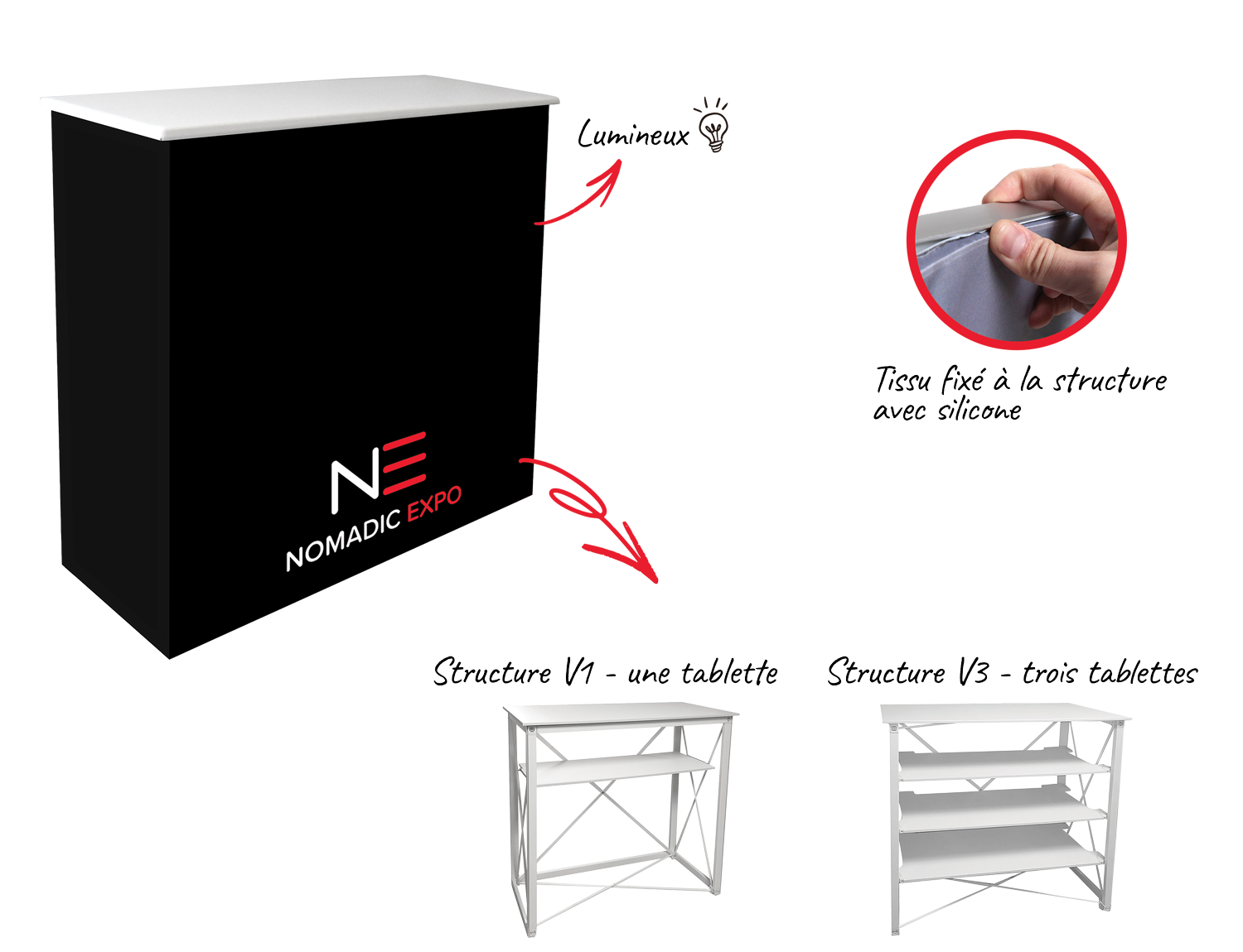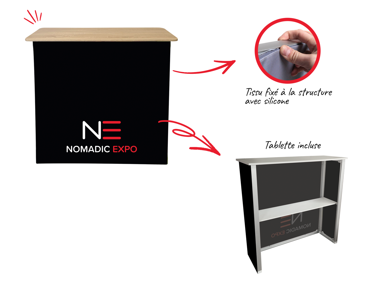 Le comptoir Easy Clik est fait d’une structure de type pop-up à installation ultra-rapide recouverte d’un tissu imprimé par sublimation. Le tissu installé avec un velcro, reste attaché à la structure pour une installation rapide et un rangement pratique. Tablette intérieur incluse.
