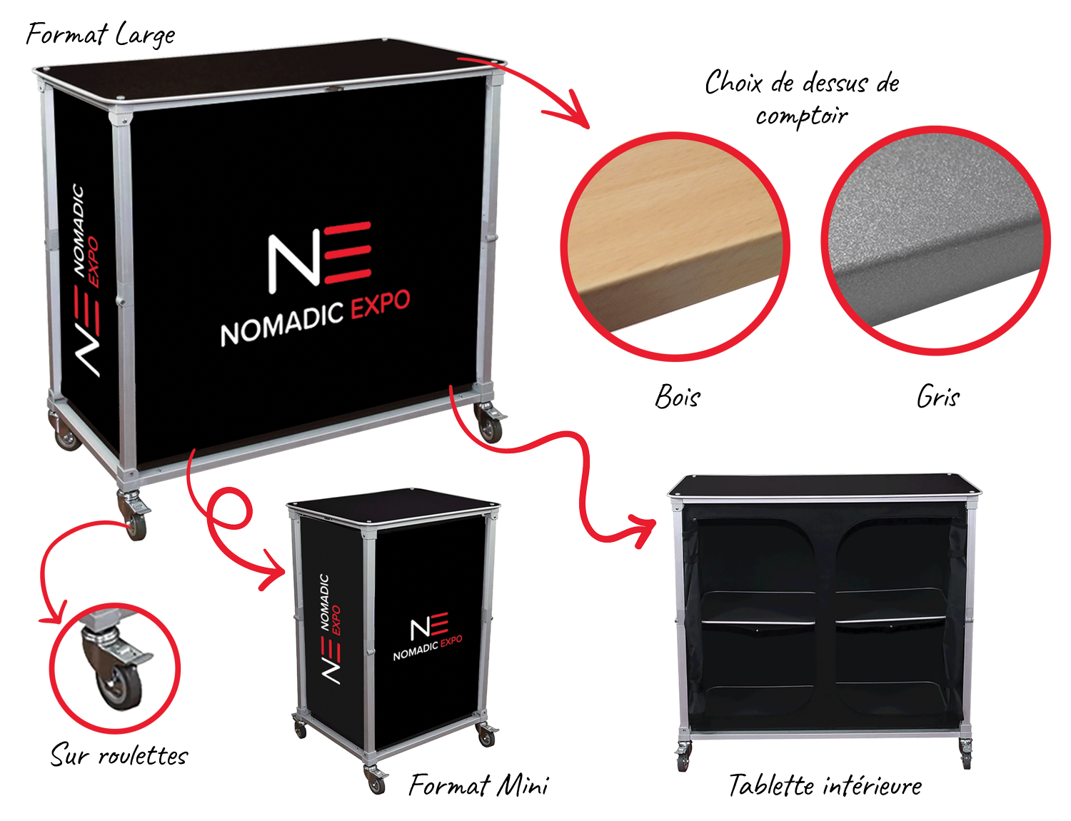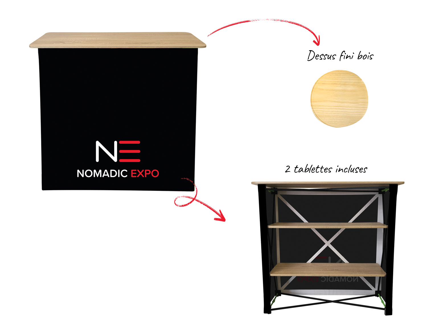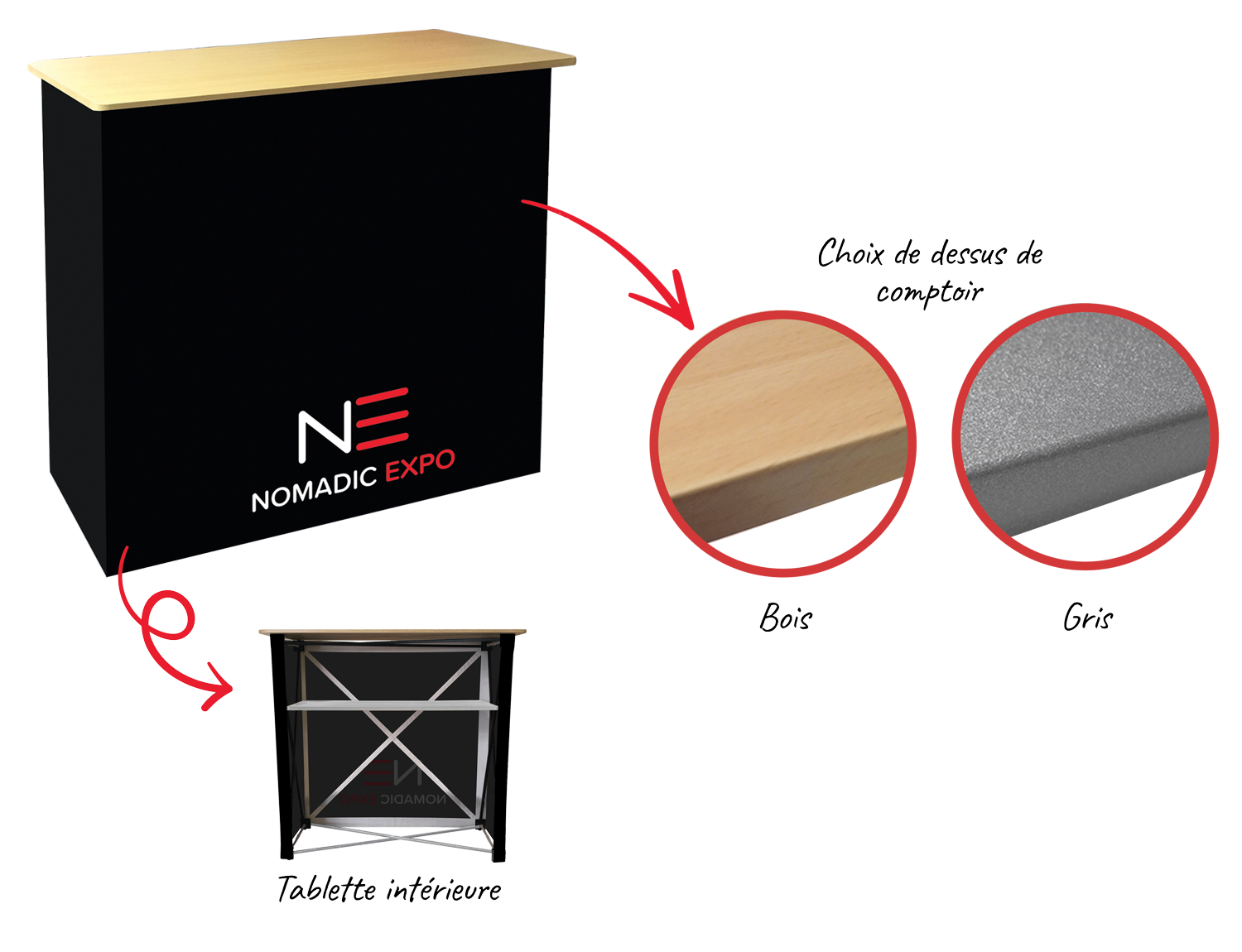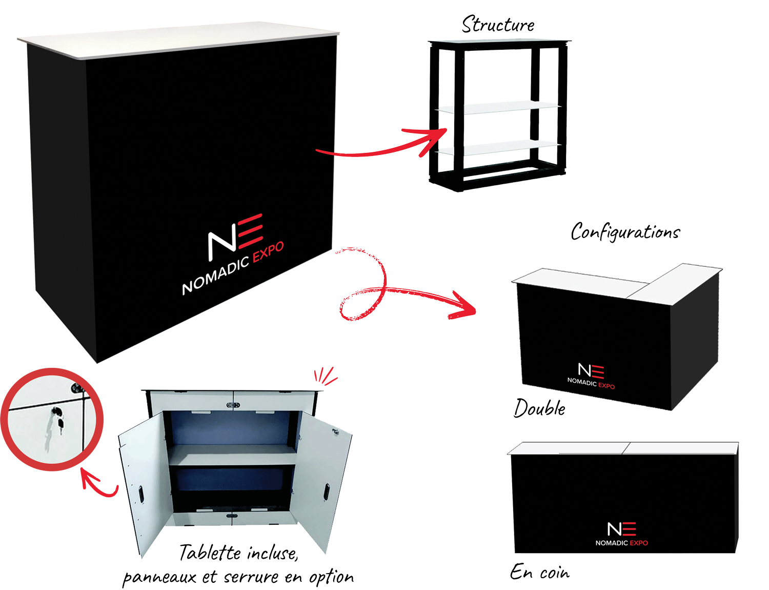 Le comptoir portable est un élément multifonctionnel et essentiel. Idéal pour mettre en valeur vos produits et votre littérature, cette espace de réception sert aussi à afficher votre marque avec l’imprimé personnalisé. Plusieurs caractéristiques distinguent nos comptoirs portatifs, mais ils sont tous pratiques et de bonne qualité.
