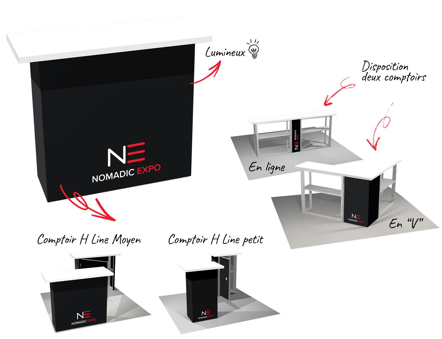 Le comptoir H Line s’adapte parfaitement à votre stand modulaire H Line. Disponible en 2 tailles, il est équipé d’étagères intérieures, en version rétroéclairée ou non, avec ou sans porte, et avec ou sans chargeur USB. Les modules de raccordement droit ou de coin vous permettent de connecter plusieurs comptoirs les uns aux autres pour former une zone de réception encore plus grande. Tout comme le reste de la gamme H Line, il est facile à monter et à transporter et disponible à l’achat ou à la location.