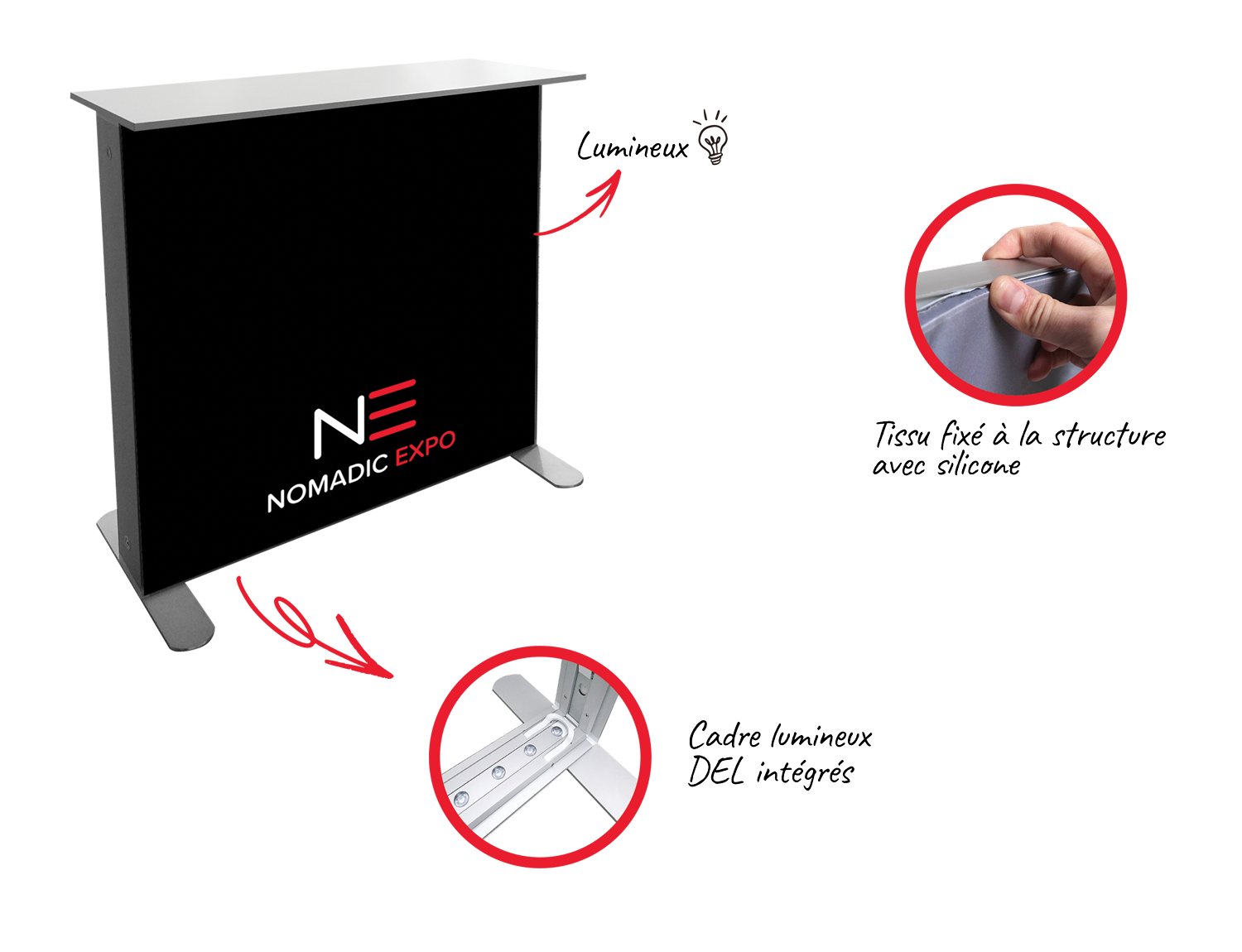Le comptoir Sego est comptoir rétroéclairé ultra pratique qui ne passera pas inaperçu. Sa structure faite de cadres comporte des lumières DEL intégrés à la barre du haut et du bas. L’impression par sublimation est faite un tissu de qualité qui diffuse parfaitement la lumière pour un effet remarquable.
