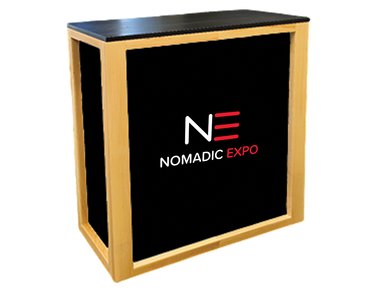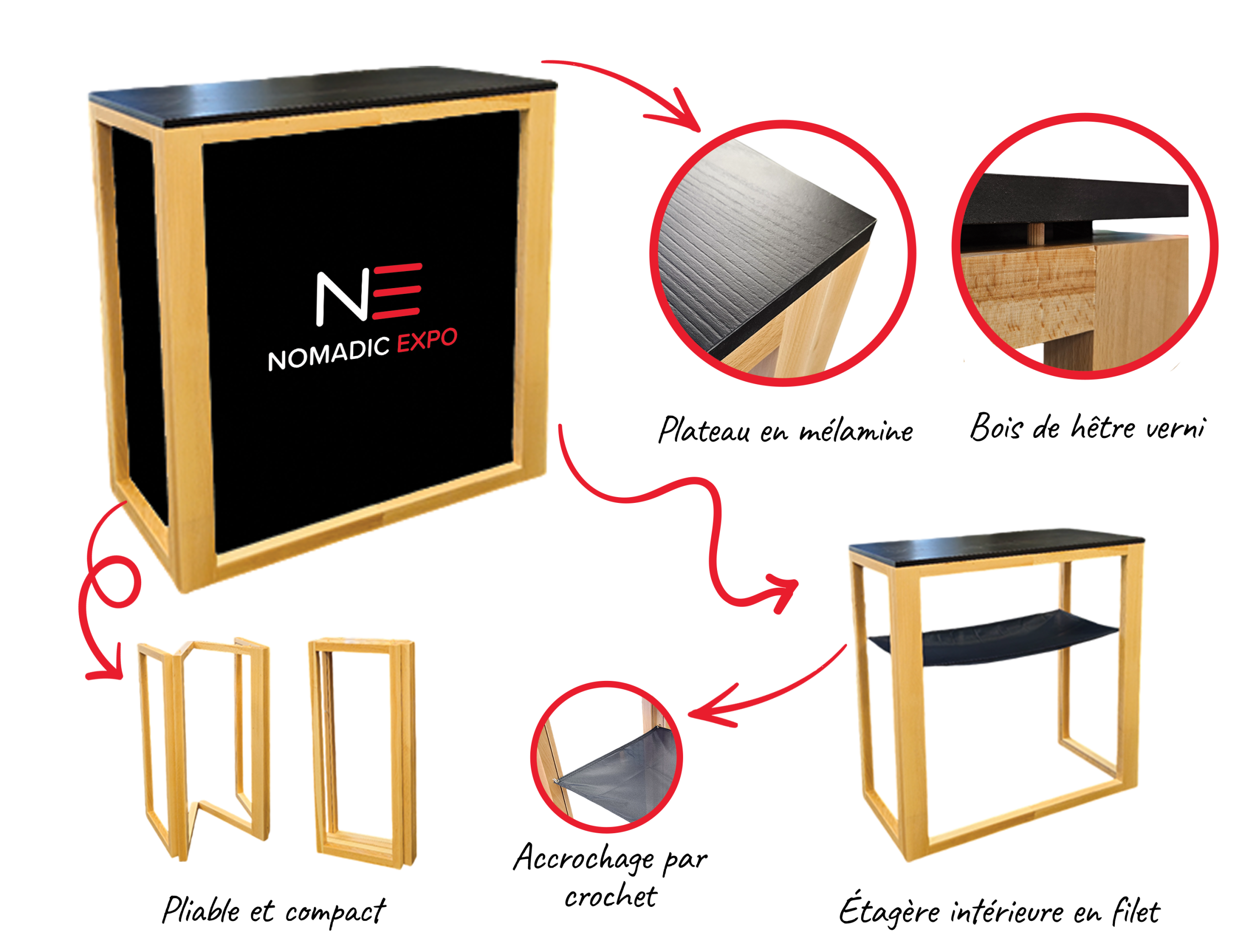 Le comptoir Naturia est fabriqué en bois de hêtre verni avec un plateau en mélanine effet bois. Pliable et facile à transporter, il comprend une étagère intérieure en filet et s’assemble en quelques secondes, sans outils. Les visuels en tissu, cousus avec un jonc en silicone, s’installent facilement de l’intérieur et se remplace en tout simplicité.
