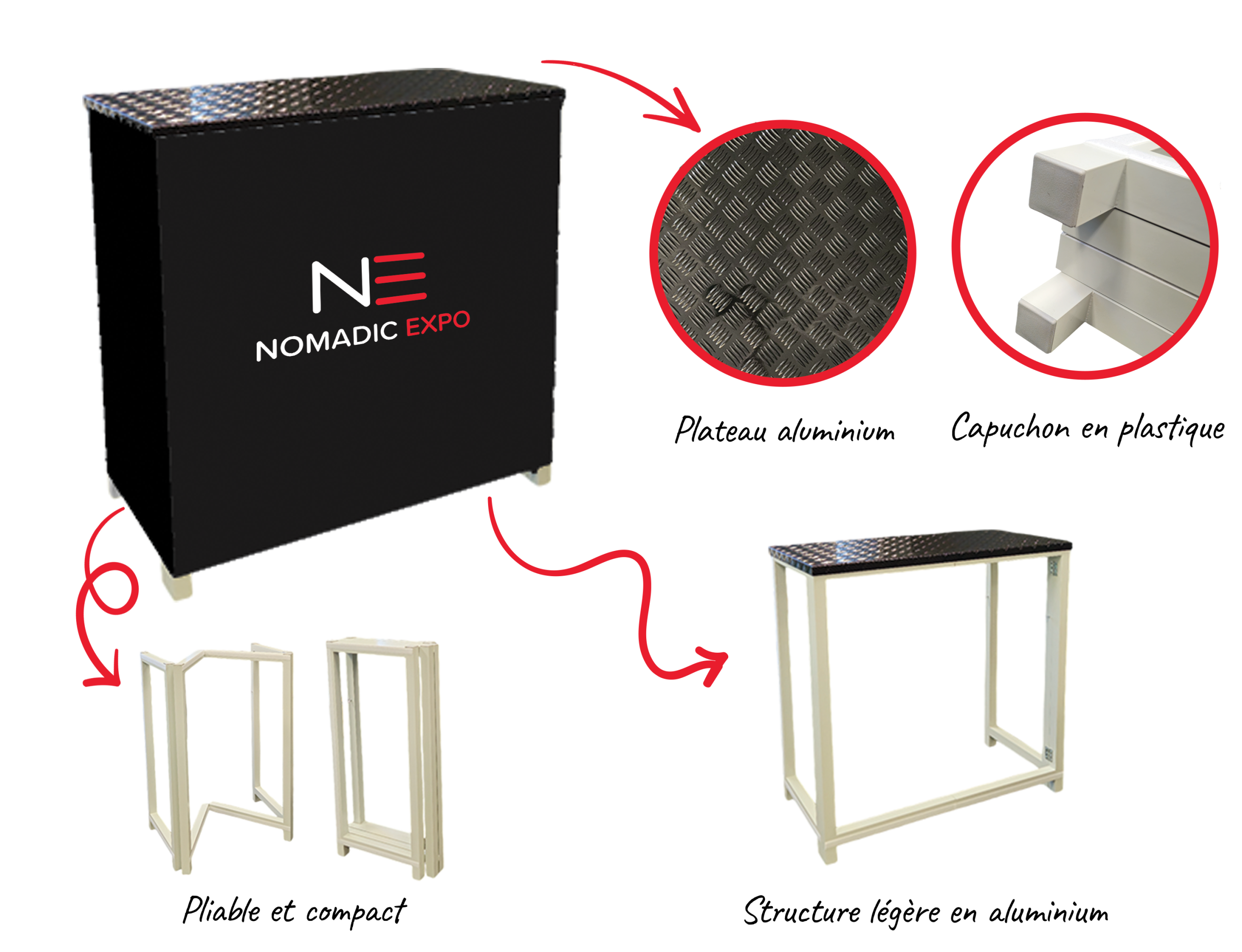 Le comptoir Titan allie légèreté et robustesse grâce à sa structure en aluminium. Son plateau noir texturé offre un look moderne. Montage rapide sans outils. Visuel facile à fixer et à remplacer grâce au velcro.